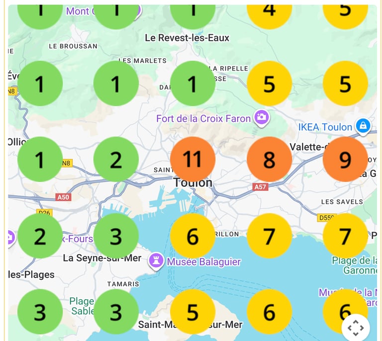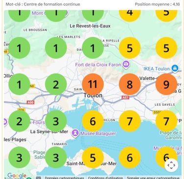 Vous recevrez un audit complet de votre fiche (visibilité + si elle est bien créée et optimisée) → Vous recevrez dans cet audit différents indicateurs de performance de votre fiche, y compris une map comme ci-dessous qui vous indiquera votre position moyenne sur un secteur géographique de 5km autour de votre secteur géographique.